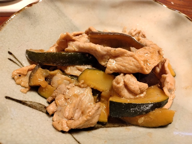 昨晩のメニューは豚肉と茄子とズッキーニの炒め物であった。