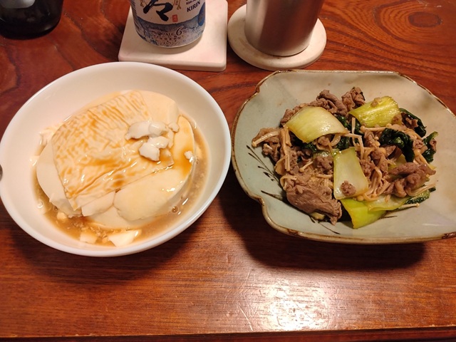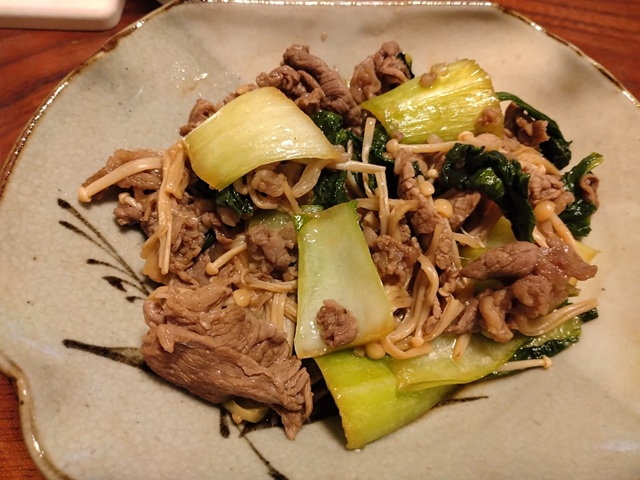 晩飯に豚肉とチンゲン菜とエノキの炒め物が出た。