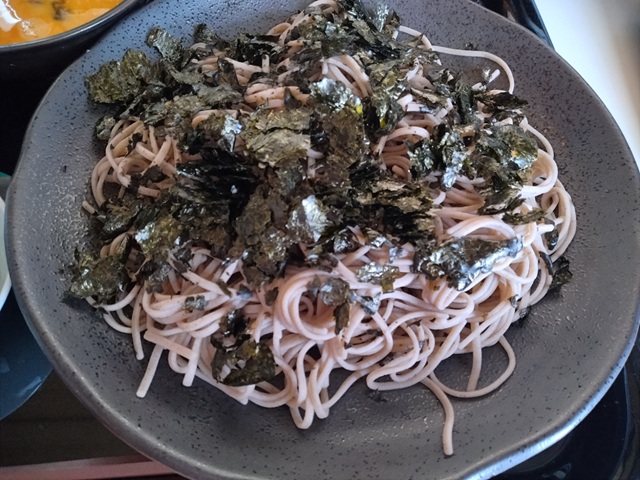 蕎麦はいつもの乾麺の十割蕎麦を使っていて、茹でた後に皿に盛って海苔を振ってある。