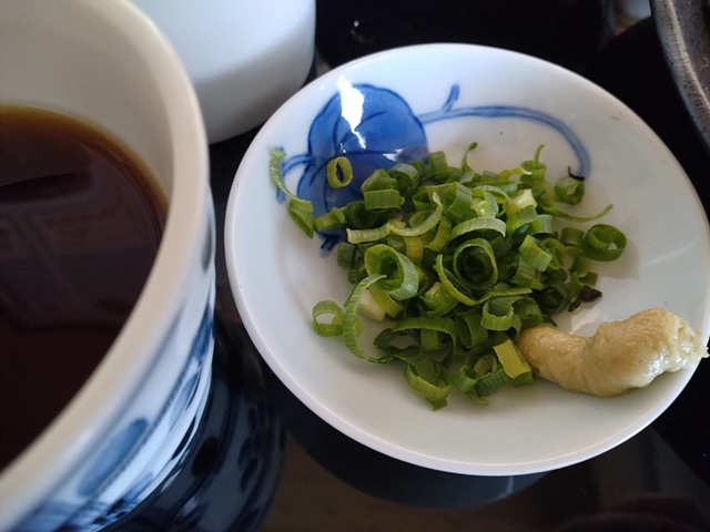 麺つゆには「にんべん」の「つゆの素」を使っていて、ざるそばなどに使う蕎麦猪口に入れてあるのだが、今回はとろろ芋と生卵を入れる積もりなので、蕎麦を浸けると溢れはしないか心配になった。
