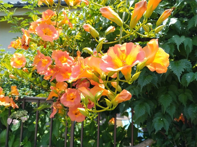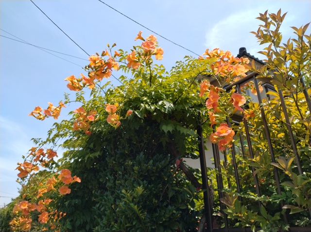 道に面した家の垣根にはノウゼンカズラという花が咲いている。