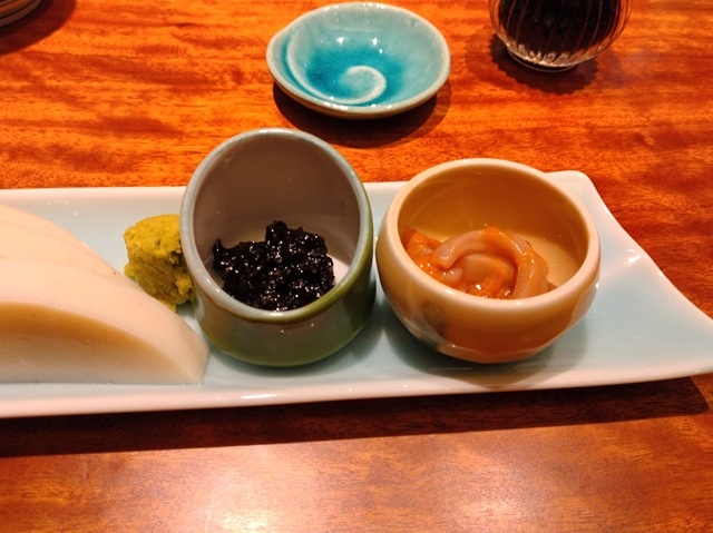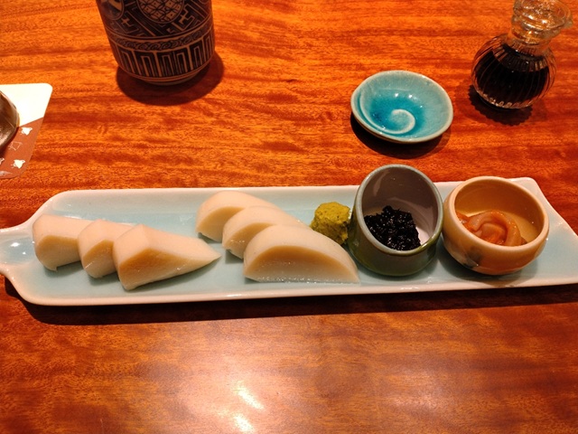 板わさの他に何やら付いてきたが、イカの塩辛ともう一つの黒い粒々は何だろうと調べてみるが良く判らない。