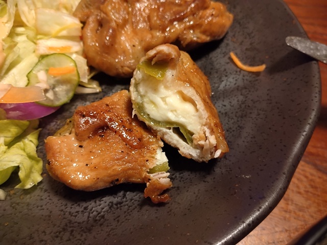 チーズを詰め込んだピーマンを、豚ばら肉で巻いて揚げ焼きにしてある。