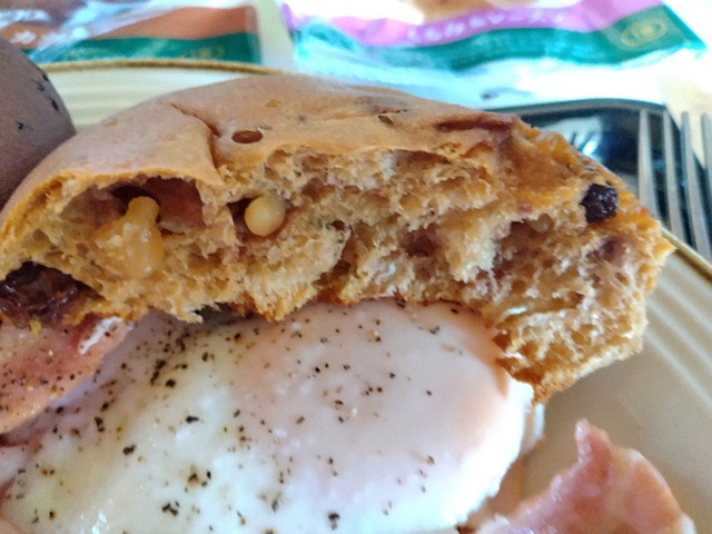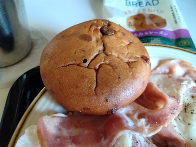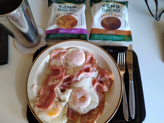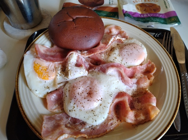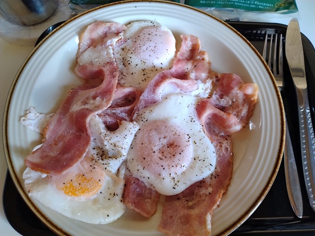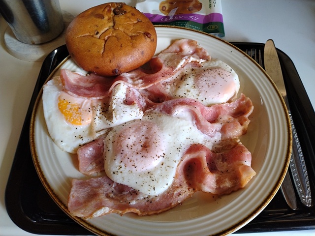 昼食なのでベーコンエッグは少し多めにして、卵3個とベーコン4枚となっている。
