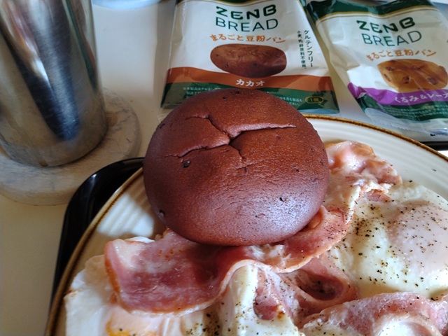 ZENB BREAD グルテンフリーの豆粉パンを買ったので、昼食にベーコンエッグと一緒に食べてみることにした。