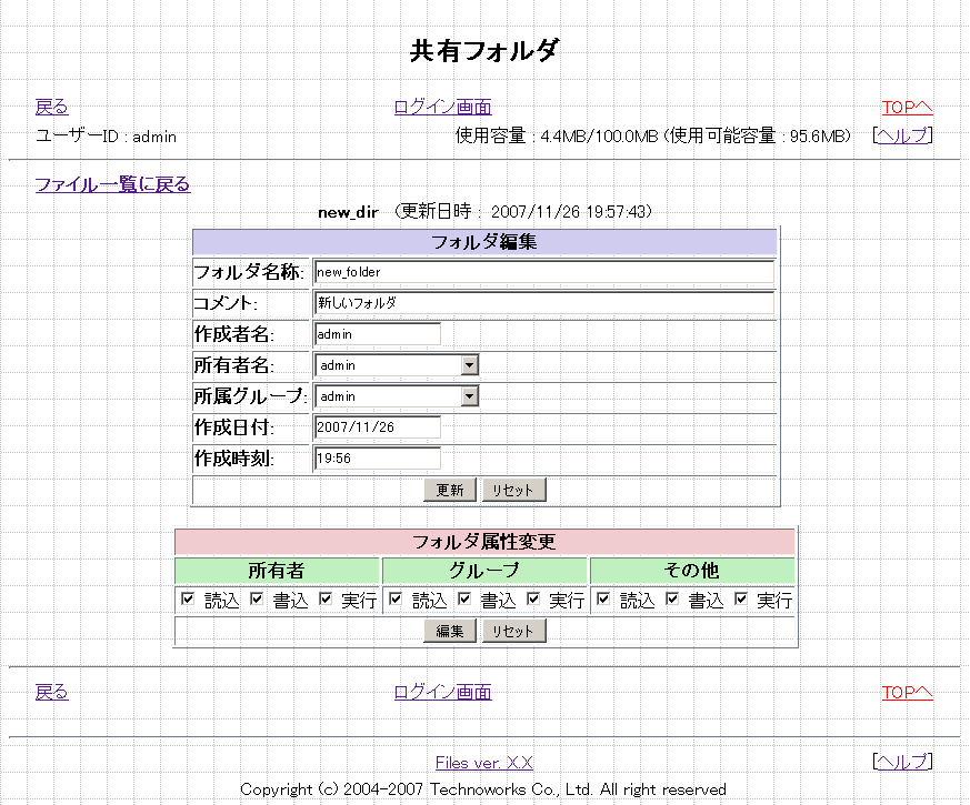 アイコンを選択すると、その行のファイル(フォルダ)のファイル名、コメント、日付、パーミッション等を変更できます。