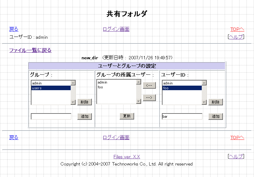 この共有フォルダにアクセスするユーザーの作成と削除、グループの作成と削除及び、ユーザーが所属するグループの設定を行います。
