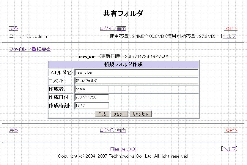 ファイル一覧上部の「フォルダ作成」を選択すると、下図のフォルダ作成画面が開きます。