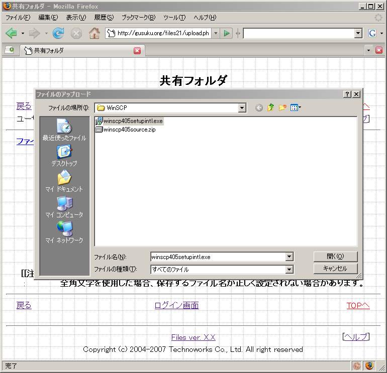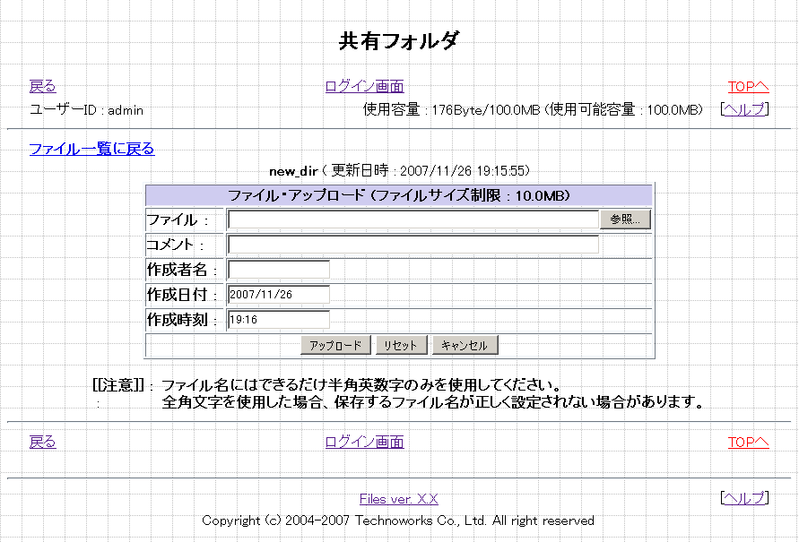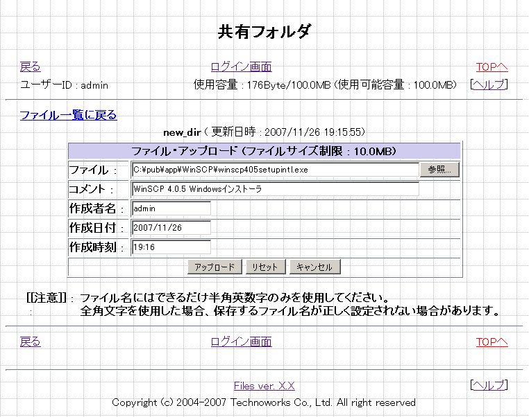 アップロードするファイル名にはダウンロードの関係で、日本語を使用しないことをお勧めします。