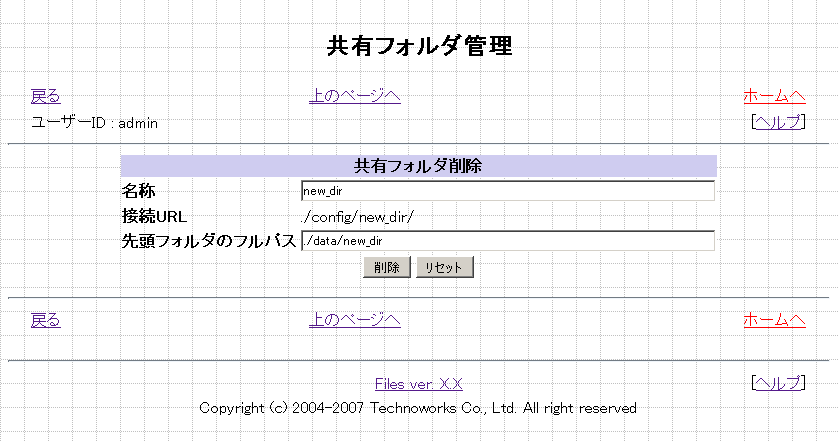 共有フォルダ一覧で「削除」を選択すると、下図の削除画面が表示されます。