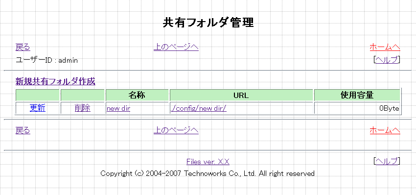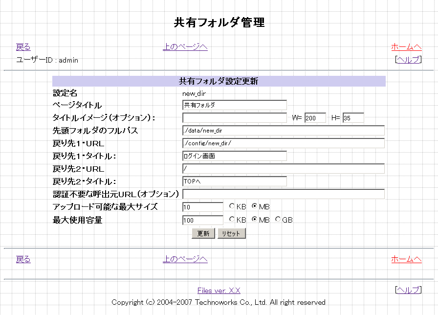 共有フォルダ一覧で「更新」を選択すると、下図の更新画面が表示されます。