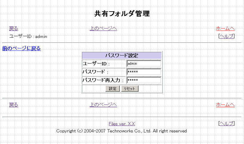 管理メニューのパスワード設定を選択すると、下図のパスワード設定画面が開きます。