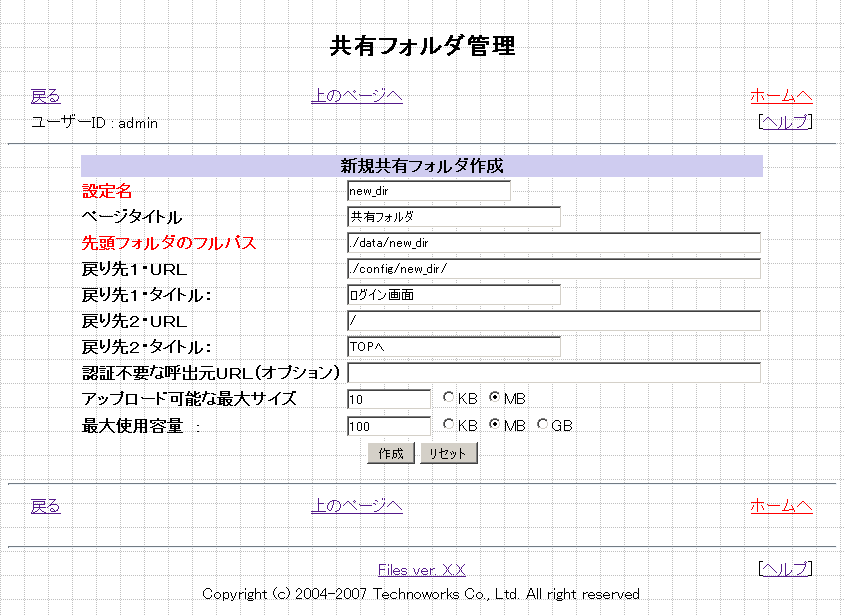 ここで指定したパスは、各共有フォルダのフッターに表示される、共有フォルダのURLに使用されるので、相対のURLではなくフルのURLを記述しておいたほうが良いでしょう。